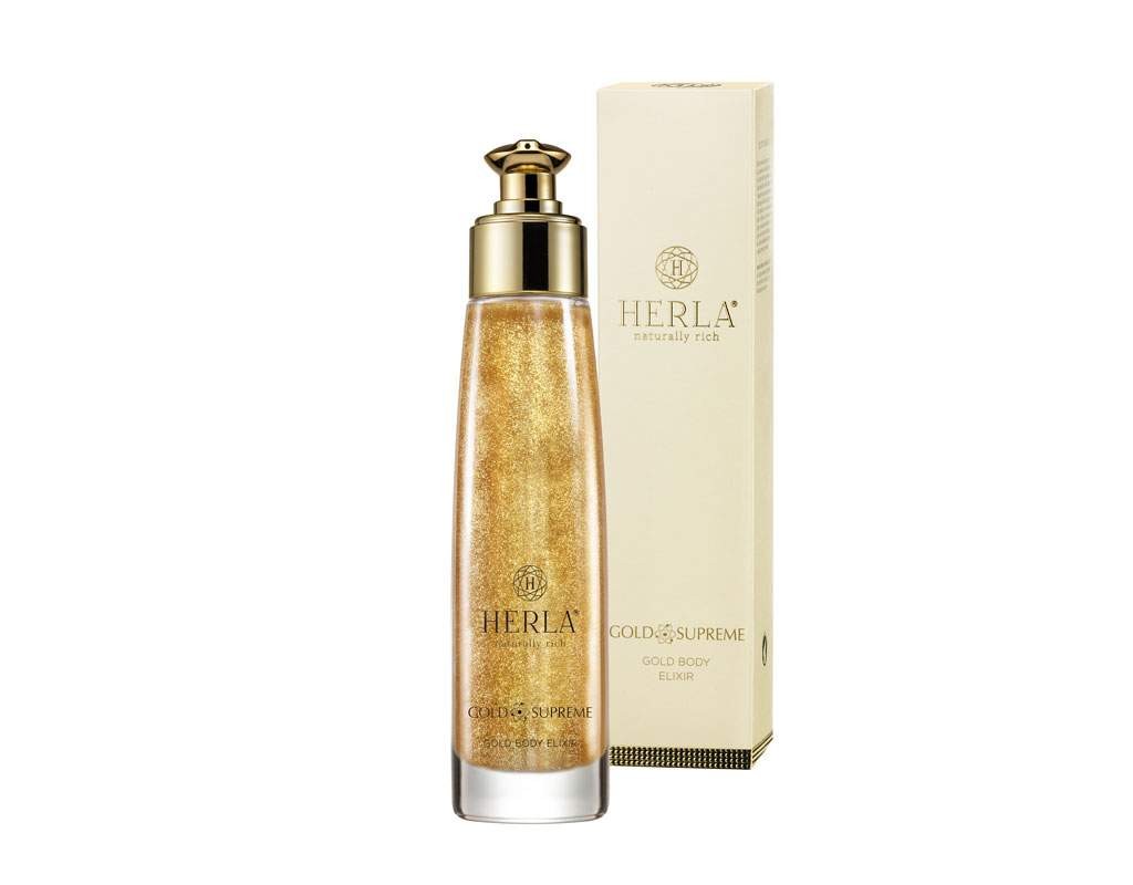 HERLA 24k Gold Body Elixir 100ml - auksinis eliksyras kūno priežiūrai. Joje esančios aukso dalelės palieka ilgalaikį odos švytėjimą. Saldus migdolų aliejus, efektyviai minkština ir išlygina odą ir neleidžia susidaryti raukšlėms. Vitaminai A ir E, gerai hidratuoja ir maitina odą. Eliksyras praturtintas natūraliais antioksidantais, kurie kovoja su laisvaisiais radikalais odoje, kad ji galėtų išlikti geros būklės kiek įmanoma ilgiau, atrodytų sveika ir spindinti.